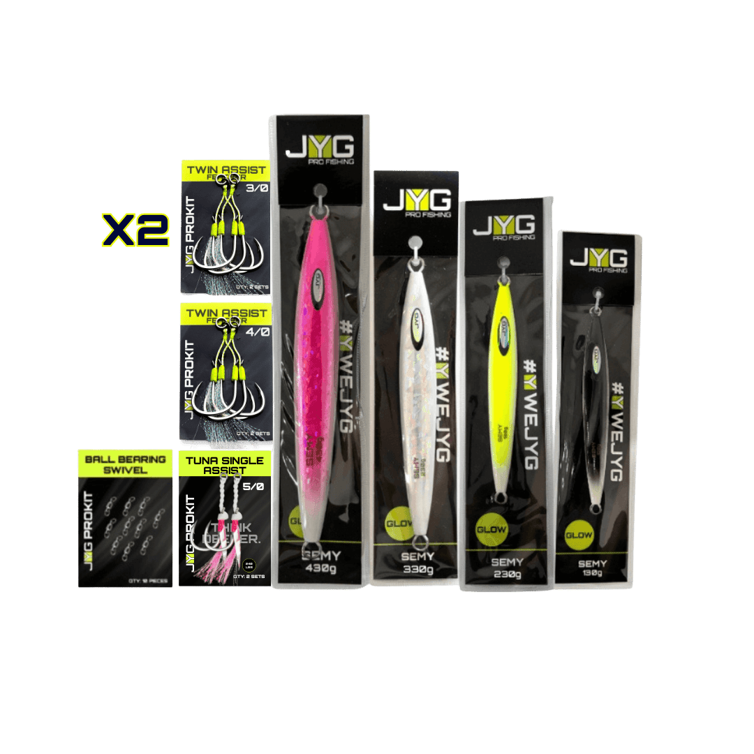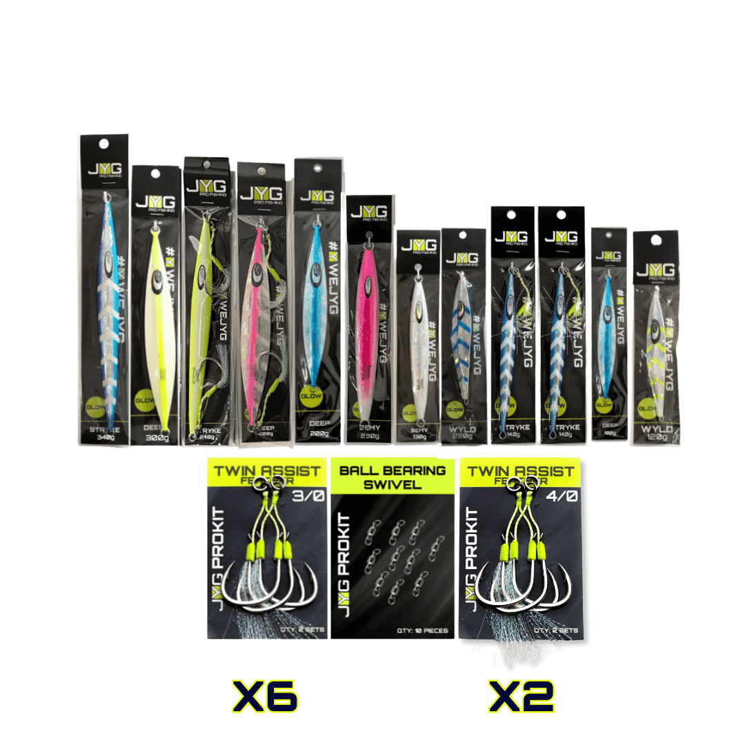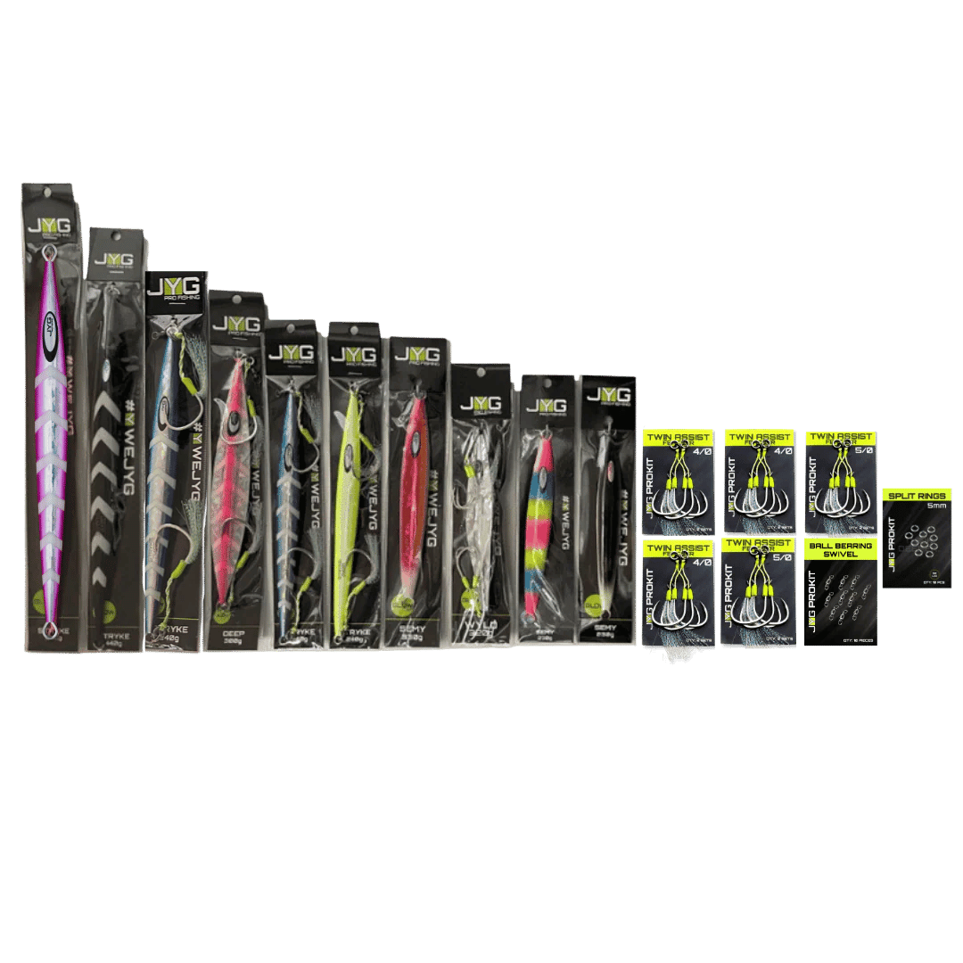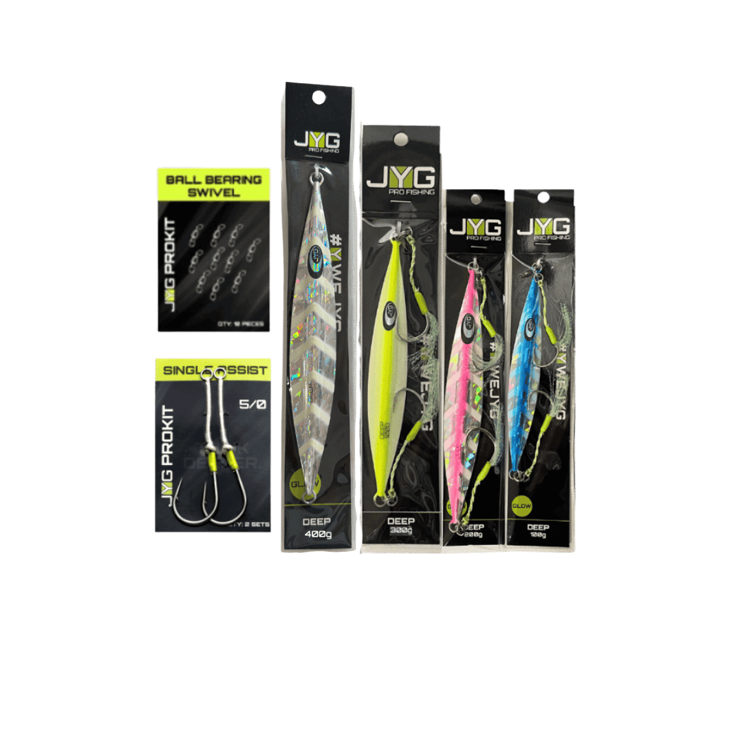 The JYG Kits offer a curated selection of jigs and accessories tailored for slow pitch jigging and vertical jigging. Designed to equip anglers with a complete setup, these kits include jigs of different weights and actions to match various depths and target species. Whether for beginners or seasoned anglers, JYG Kits provide reliable gear for immediate use in a range of fishing conditions.