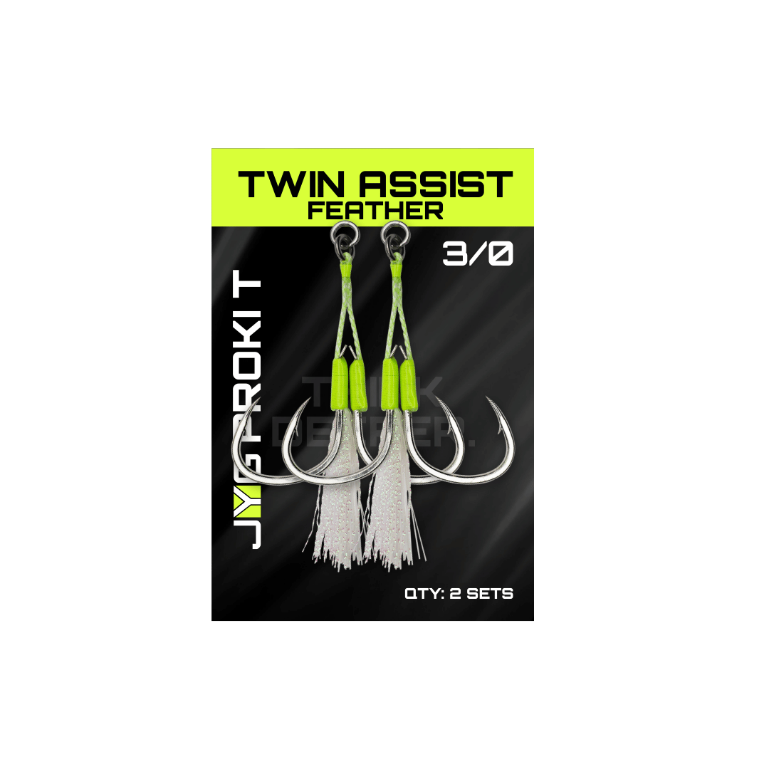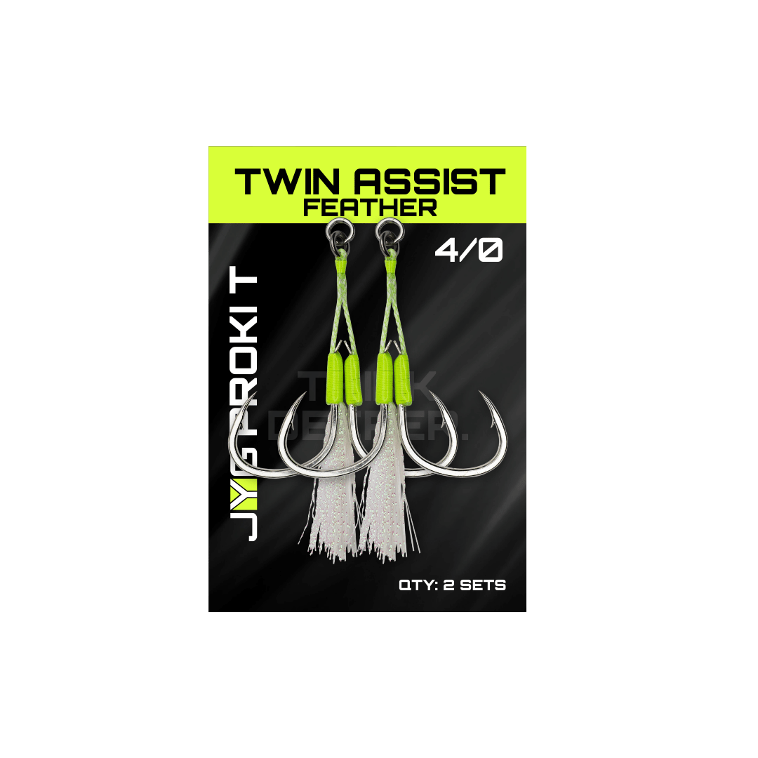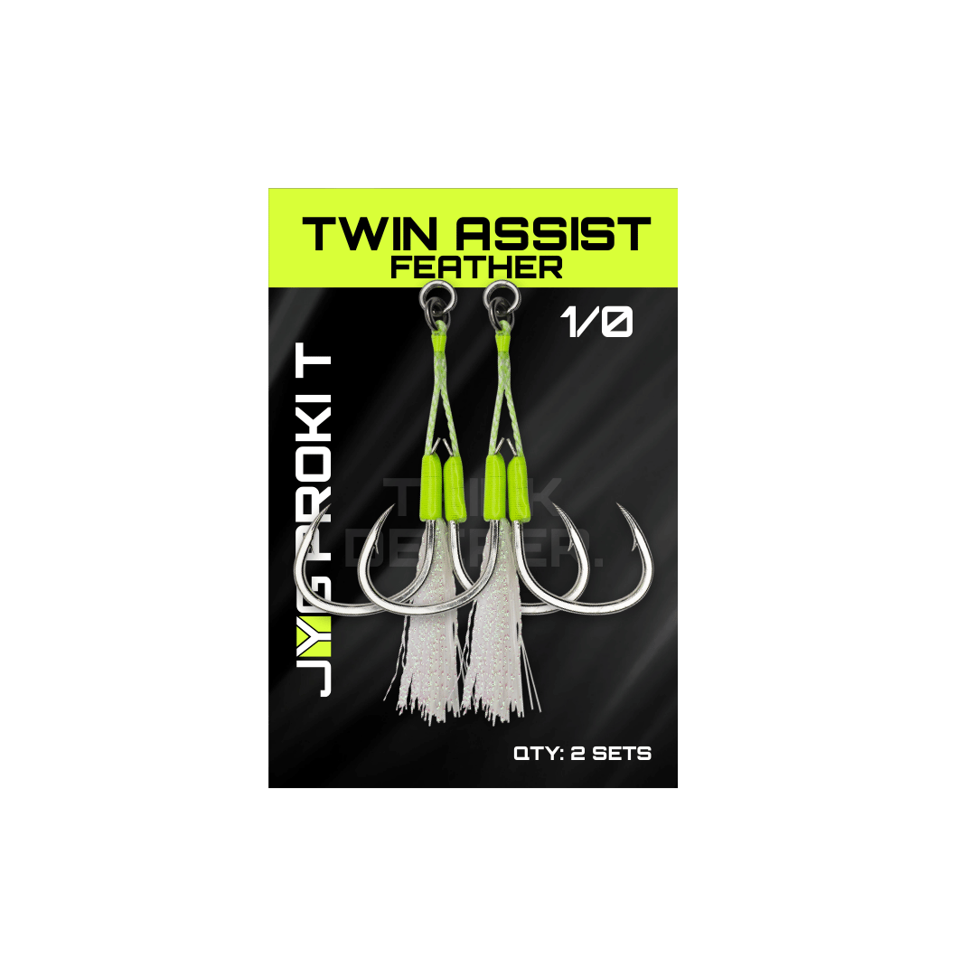 Upgrade your slow pitch jigging setup with JYG PRO Twin Assist Feather Hooks—super strong, extremely sharp, and built to improve hook-up ratios with a double-hook design. Each rig features forged hooks, a heavy-duty split and solid ring for quick attachment, and a feather dressing designed to stand out in deep or low-visibility conditions.